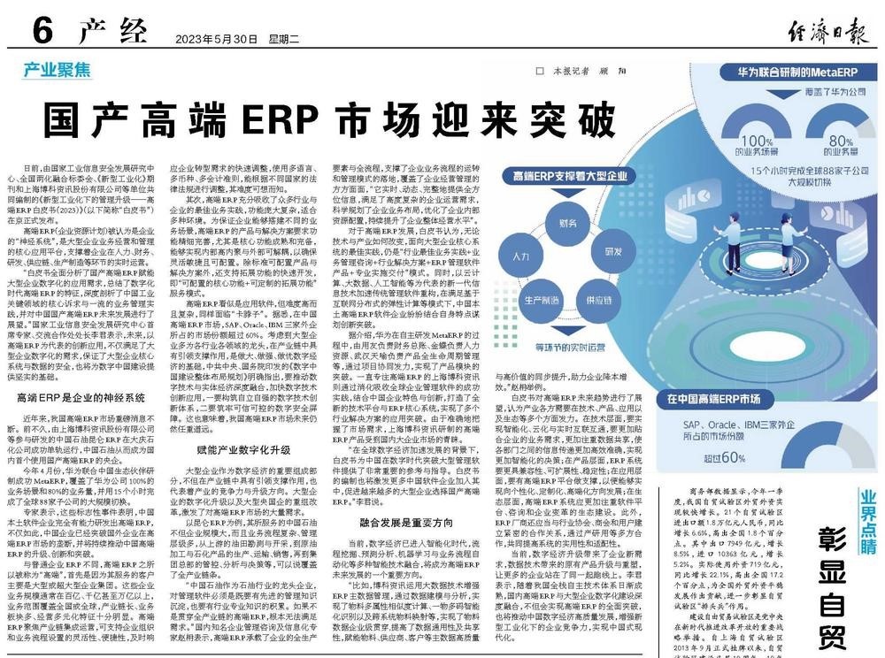 当前,数字经济升级带来了企业新需求,数据技术带来的原有产品升级与重塑,让更多的企业站在了同一起跑线上。李君表示,随着我国全栈自主技术体系日渐成熟,国内高端ERP与大型企业数字化建设深度融合,不但会实现高端ERP的全面突破,也将推动中国数字经济高质量发展,增强新型工业化下的企业竞争力,实现中国式现代化。
