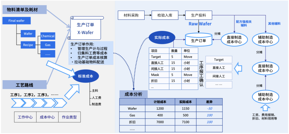 某新兴半导体企业(12英寸集成电路成套工艺研发平台)存在生产工艺及配方复杂多变、辅料成本核算难度大、缺乏标准成本和实际成本的计算体系以及合理的成本分摊模型等困难,公司通过建立ERP系统,并将MES系统与之融合,使问题得到有效解决。